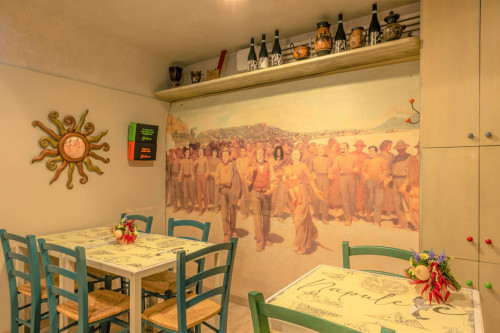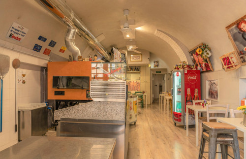 L'interno si compone di sala principale dove si trova il forno a legna e gas, il banco per la stesura della pizza e la vetrina porta condimenti refrigerata, nove tavoli, colonna frigo negativa/positiva.