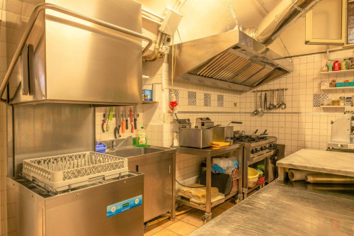 La cucina è composta da quattro fuochi, bollitore, due friggitrici, cella frigo, congelatore a colonna, congelatore pozzetto, impastatrice, forno ventilato, forno pizza senza glutine e banco, frigo, abbattitore, tavolo in acciaio, due lavelli, lavastoviglie, cappa aspirante, planetaria.